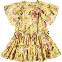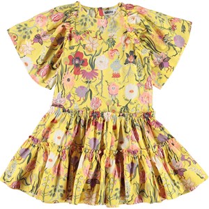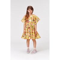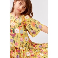 Cat is a sculptural, full, poplin dress in yellow with a print of dancing flowers. It has puff sleeves and a zip closure at the neck. It has puff sleeves and a zip closure at the neck.
