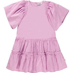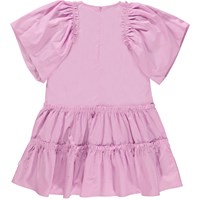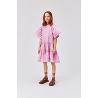 Cat is a pink dress in a loose fit. The dress is in organic cotton and has raised shoulder seams with short sleeves and a back zip closure. The full skirt begins at the hips and consists of large, sewn on ruffles that stop at the knees.