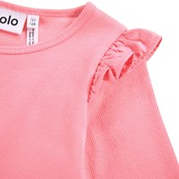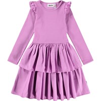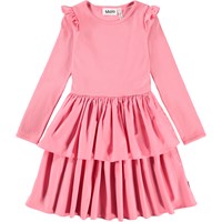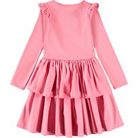 Long-sleeved pink dress made of organic cotton with a close-fitting ribbed jersey top, a round neckline, a small ruffle at the shoulders and a skirt in double-layer cotton poplin to add of volume.