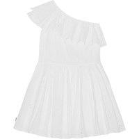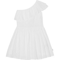 White, asymmetrical, one-shoulder dress in organic cotton. It has a ruffle and a small sleeve on the left side. The dress is knee length and in a loose fit. It has a stretchy waist seam and a gathered, lined skirt to make sure that it isn't transparent. The dress is constructed in a unique broderie anglaise.