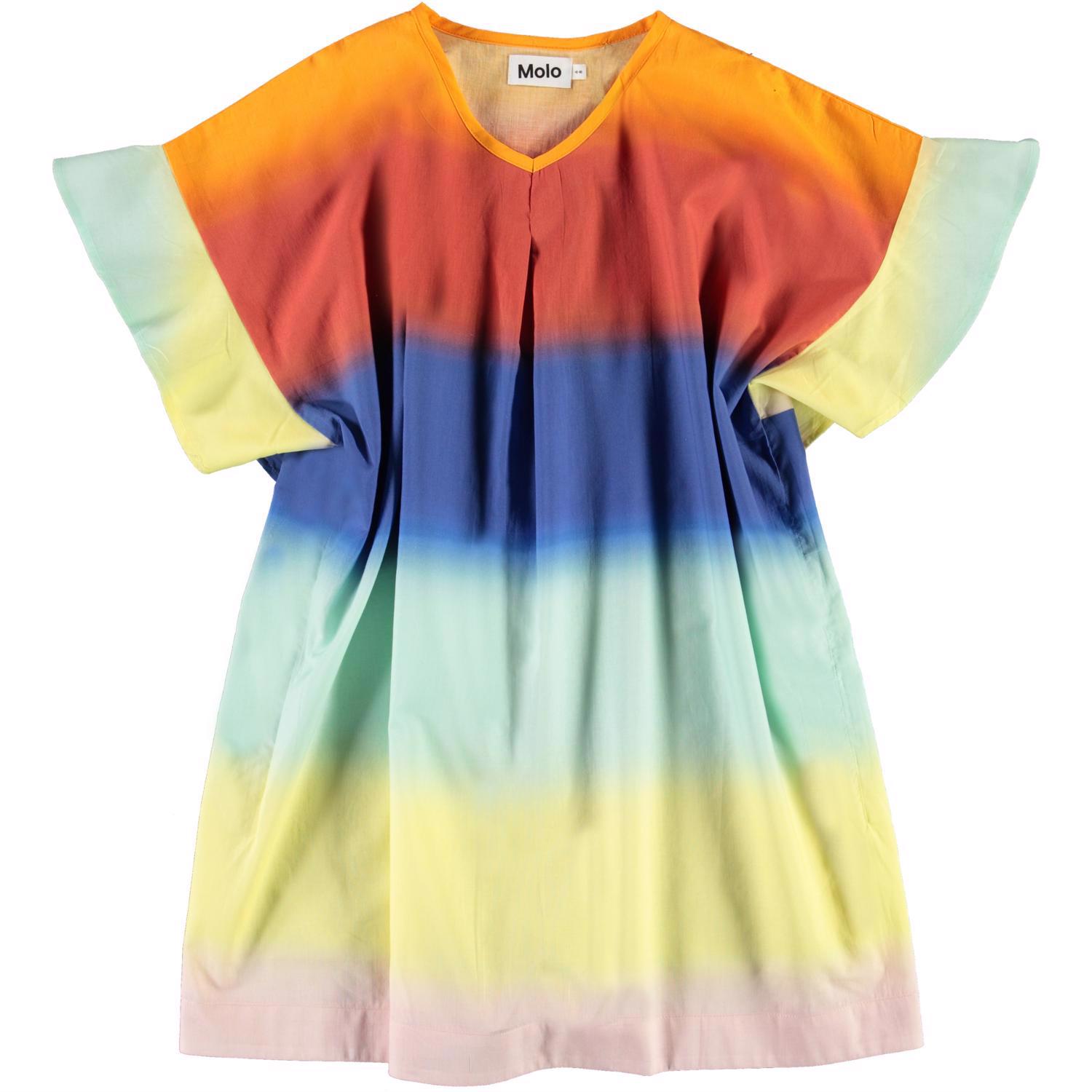 Beautiful and colourful tunic with ruffle sleeves and soft, wide rainbow stripes. It's easy to slip on over swimwear for a day at the beach. The tunic is in 100% organic cotton.