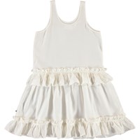 Charlotte is a white dress with a draped, full skirt.