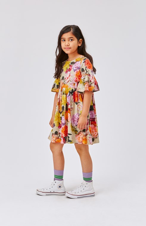 Chasity is a multi-coloured dress in organic cotton jersey. It has a wide, gathered band of fabric at the bottom of the sleeves and a full, airy skirt. Chasity is in an all over print with all the garden's roses in a variety of colours.