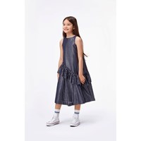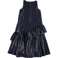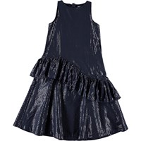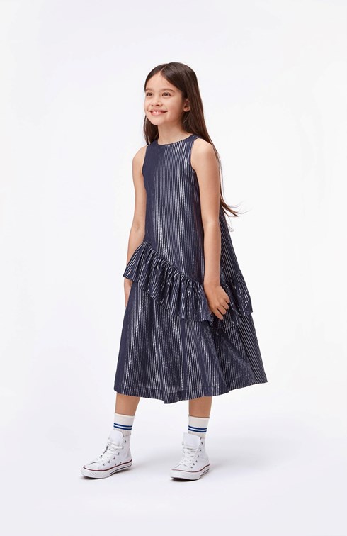 Chelsea is an elegant, dark blue dress with narrow silver stripes. The dress is sleeveless and has a slanted ruffle on the front and a zip closure at the neck.