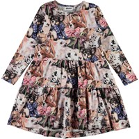 Chia is a dress with a print of small dogs that have ribbons around their necks. It has long sleeves and a loose, comfortable fit.