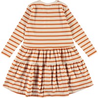 Chia is an orange breton striped dress. It has long sleeves and a comfortable, loose fit.