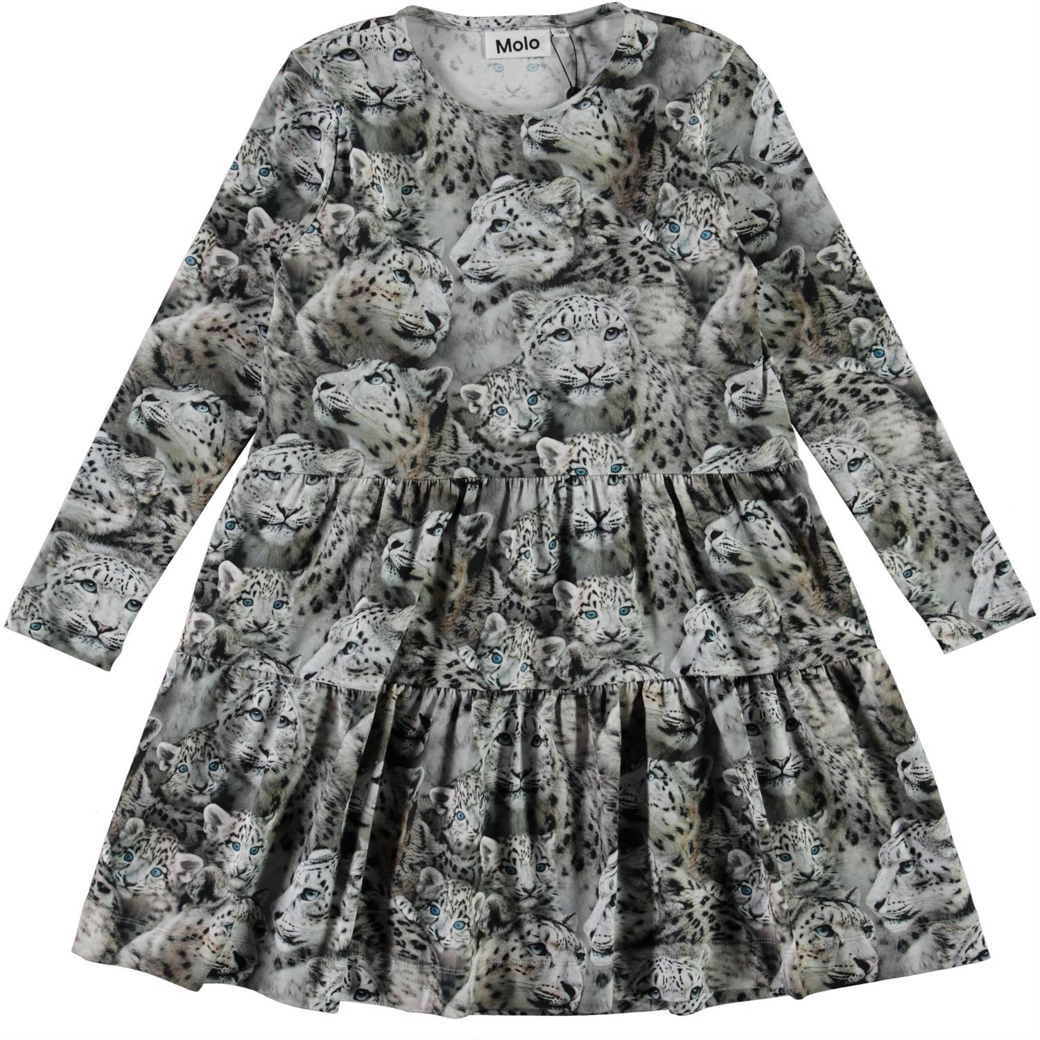 Chia is a dress with a snow leopard print. It has long sleeves and is in a loose, comfortable fit.