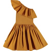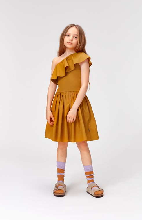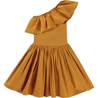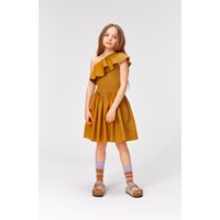 Chloey is a dream of a brown dress. It is asymmetrical and has a ruffle edge over one shoulder. The top of the dress is in rib while the full skirt is in organic cotton poplin.