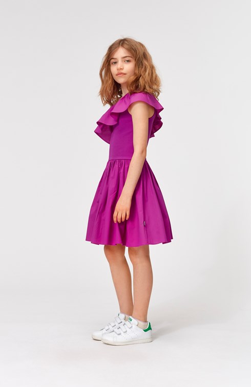 Chloey is a dream of a purple dress. It is asymmetrical and has a ruffle edge over one shoulder. The top of the dress is in rib while the full skirt is in organic cotton poplin.