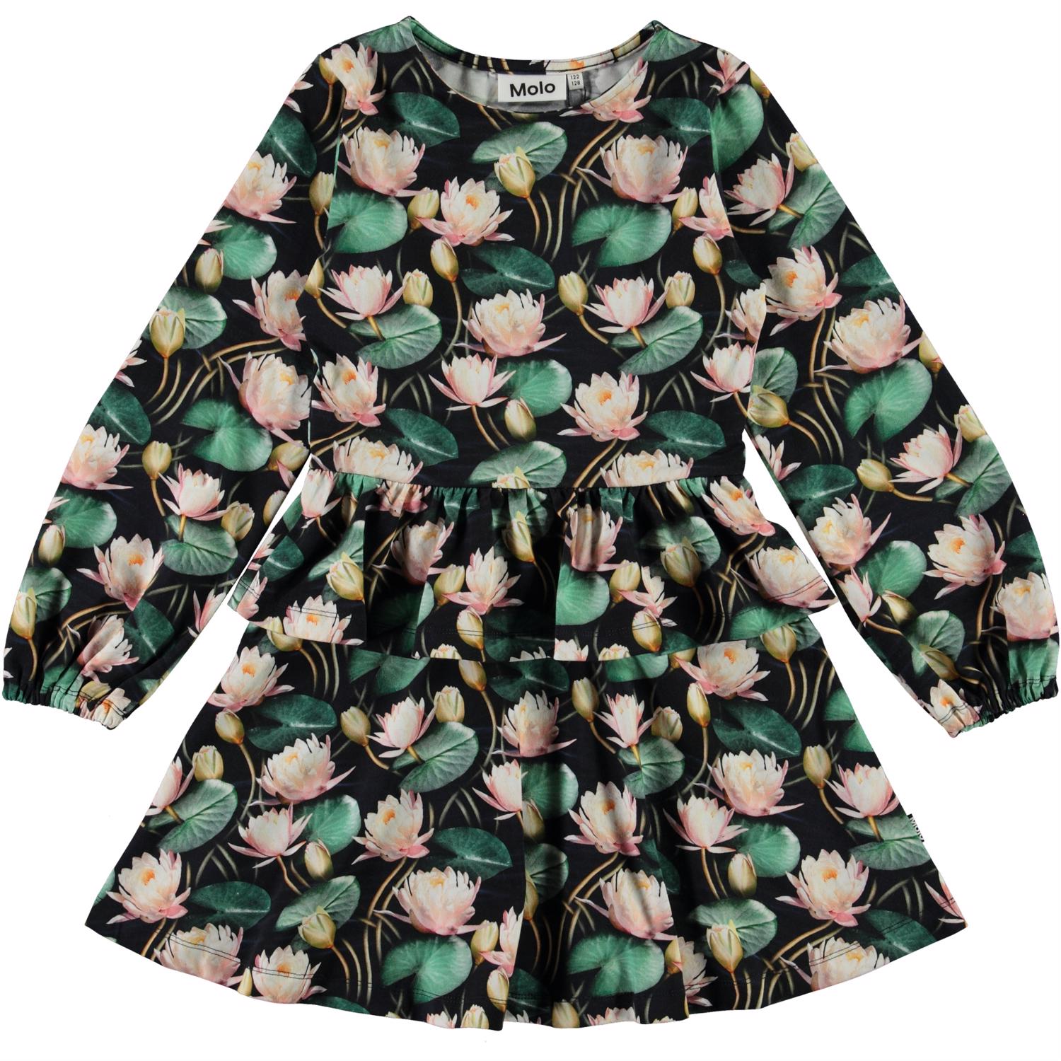 Christabelle is a long sleeve dress with pink water lilies. It has a peplum skirt and full sleeves.