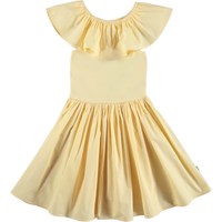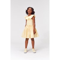 Christal is a light yellow sleeveless dress, where the top is in rib with a large ruffle collar. The full skirt is in poplin.