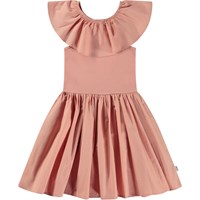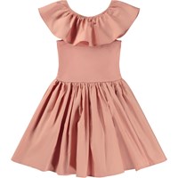 Pink knee length dress with a poplin collar and skirt. The poplin collar has elastic and can be worn up like a collar or off the shoulders like sleeves. The body of this dress is in 100% cotton jersey, while the collar and skirt are in 100% cotton poplin. The dress is in a slim fit. You can style the dress with a long sleeve top and tights for cold days, or wear it alone on sunny, warmer days.