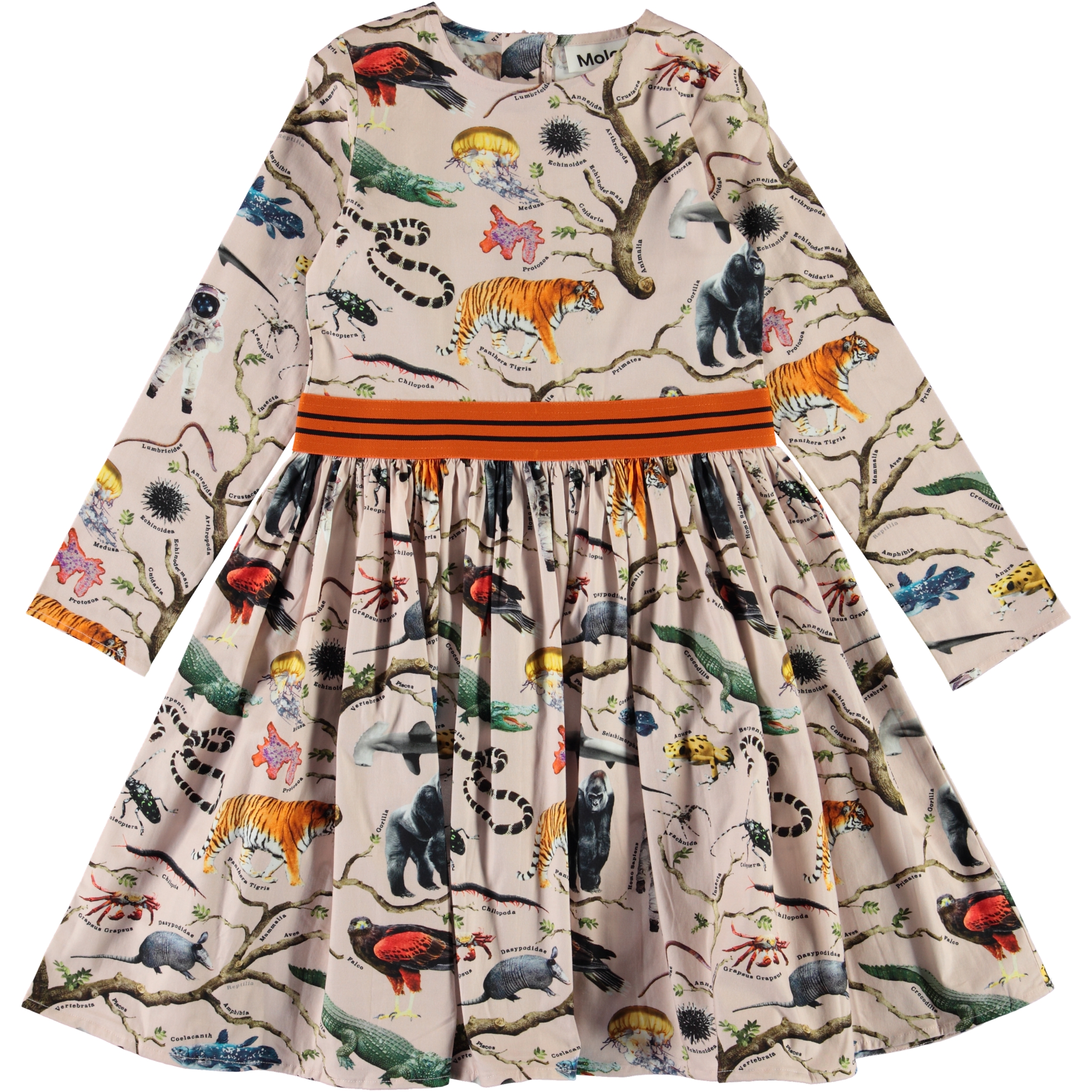 Christin is a long sleeve dress in pink with the all-over 'Tree of Life pink' print, which shows different animals and a pair of aliens too. The dress has a striped orange band at the waist and a zip neck.
