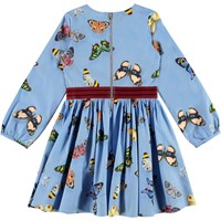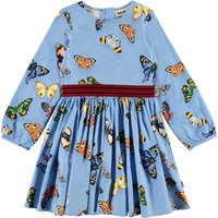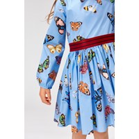 Christine is a light blue polin dress with a butterfly print and a red ribbon at the waist. The dress is in a stretch poplin that makes it incredibly comfortable.