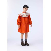 Orange knee-length dress made of viscose. The dress has a round neckline, a fine button closure at the front, elastic around the wrists and an attached circular-cut skirt. The bodice is decorated with a floral print and a delicate ruffle edge.