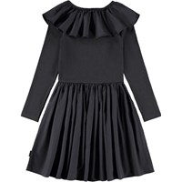 Black knee-length dress made of organic cotton with a fitted jersey top and a voluminous skirt made of cotton poplin. The dress has long sleeves and a large poplin collar that can be worn off-shoulder.