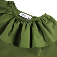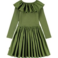 Green knee-length dress made of organic cotton with a fitted jersey top and a voluminous skirt made of cotton poplin. The dress has long sleeves and a large poplin collar that can be worn off-shoulder.
