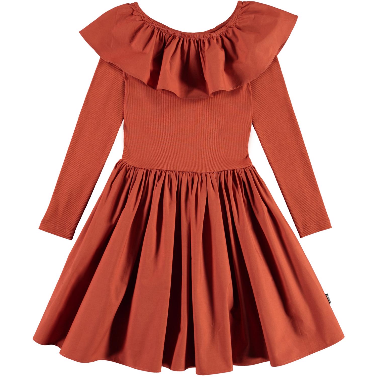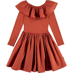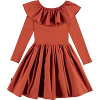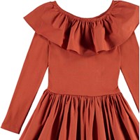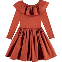 Cille is a 'One of a kind' dress, which is both extremely comfortable and looks great. The dress is long sleeved and brown with a rib top and a peplum skirt and a big, full collar.