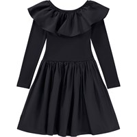 Black, knee length dress with long sleeves and with a poplin collar and skirt. The poplin collar has elastic and can be worn on the shoulder as a collar or off the shoulder as sleeves. The dress is in 100% cotton jersey, while the collar and skirt are in 100% cotton poplin and is in a slim fit.