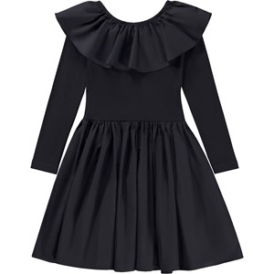 Black, knee length dress with long sleeves and with a poplin collar and skirt. The poplin collar has elastic and can be worn on the shoulder as a collar or off the shoulder as sleeves. The dress is in 100% cotton jersey, while the collar and skirt are in 100% cotton poplin and is in a slim fit.