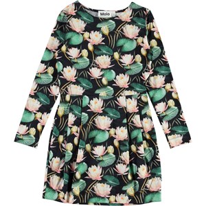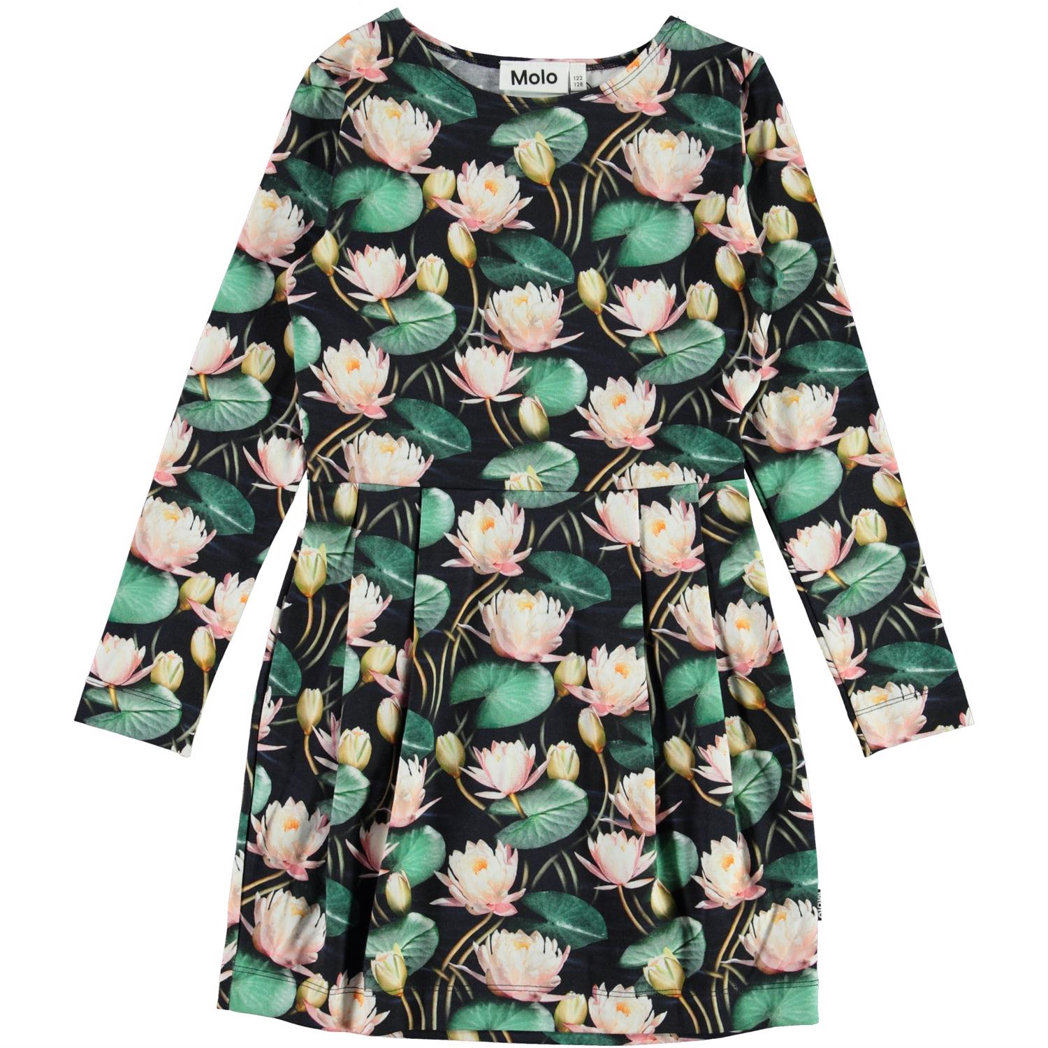 Cindarell is a long sleeve dress with a print of pink water lilies. The dress has long sleeves and is body conscious without being tight and form-fitting.