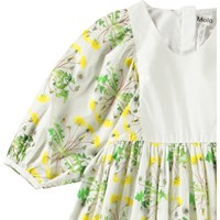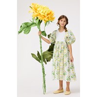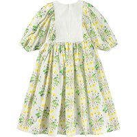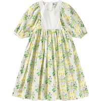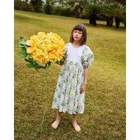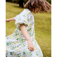 White dress in organic cotton with a round neckline and puffed sleeves with buttons. The dress falls to mid-calf, has a loose fit, and features an invisible zip at the back for easy on and off. The skirt and sleeves have an all-over print of blooming sunflower plants.