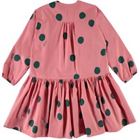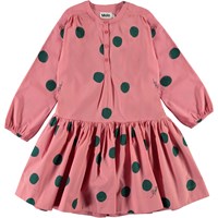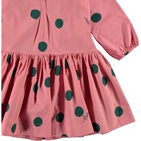 Cezanne is a pink poplin dress with a print of large green dots. It has buttons at the collar and a 'drop waist', which gives the dress a great shape.