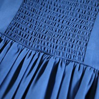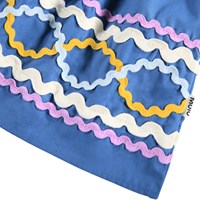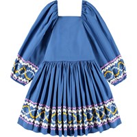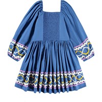 Blue knee-length dress made of organic cotton with voluminous sleeves and square neckline at the front and back. The dress has a smocked panel on the back to make it fitted but still easy to put on. The sleeves have elastic at both the shoulders and sleeve edges. The dress has beautiful zig-zag ribbons in different colors on the sleeves and skirt what gives a unique detail.