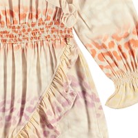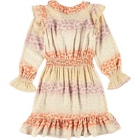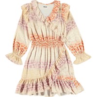 Ciris is a dress with a pastel coloured leopard print. The dress has a wrap around effect with ruffle edges and elastic at the waist and sleeves.