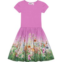 Black, short sleeve dress with a circular skirt in organic cotton. The top is in a rib jersey and is snug fitting, while the skirt is in cotton poplin with a print of cars that are shooting flames in the dark, night sky.