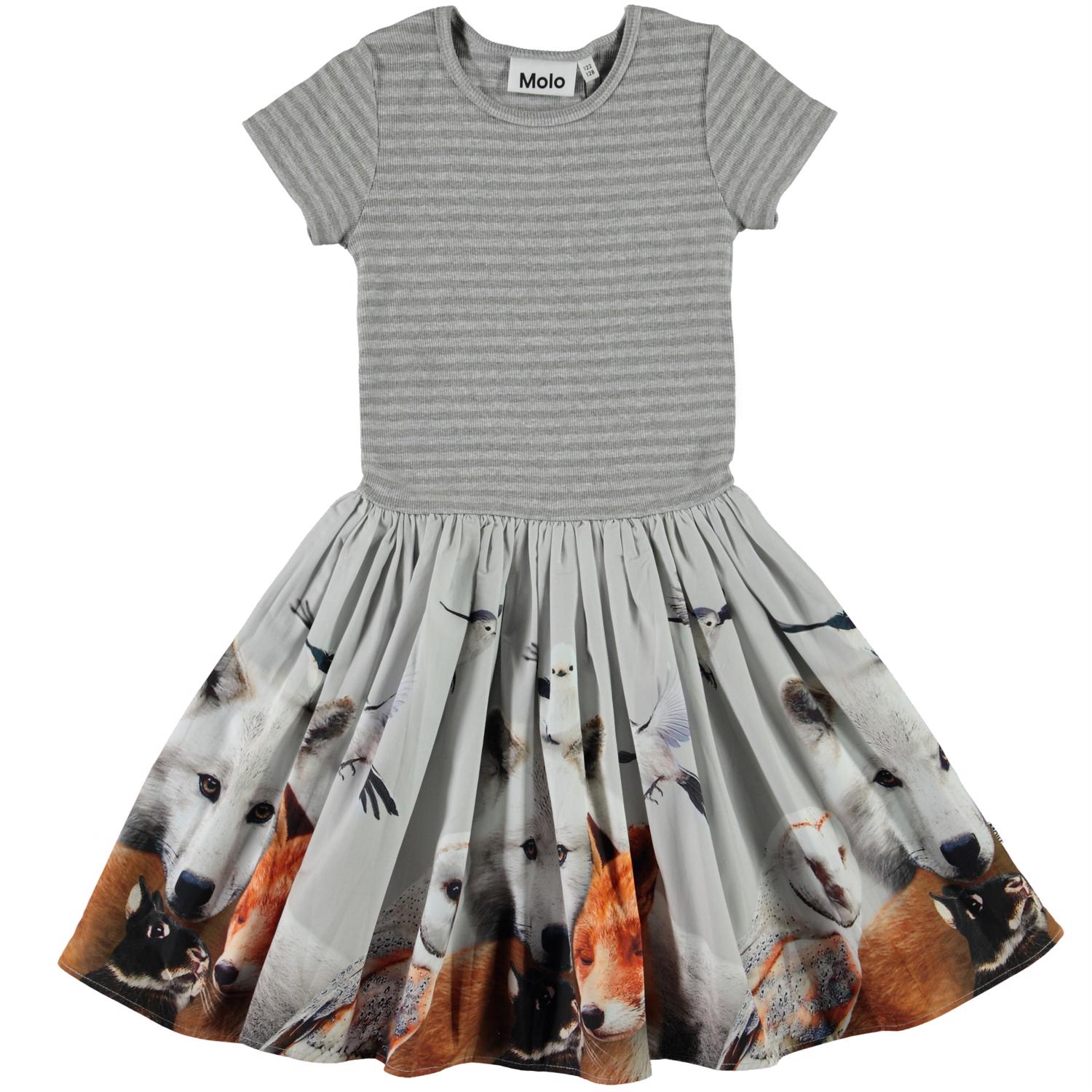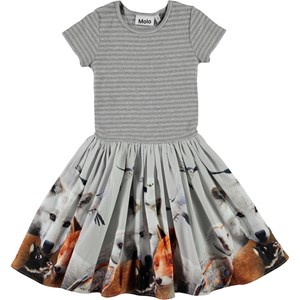 Cissa is a short sleeve dress in two parts: the top is in a grey striped rib and the skirt is in a print of differnt forest animals.