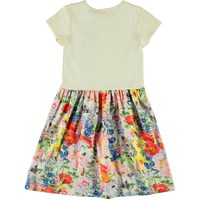 Cissa is a short sleeve dress with a light yellow top in rib and a feminine skirt with the 'Hide and Seek' print that shows different animals hiding in the flowers.