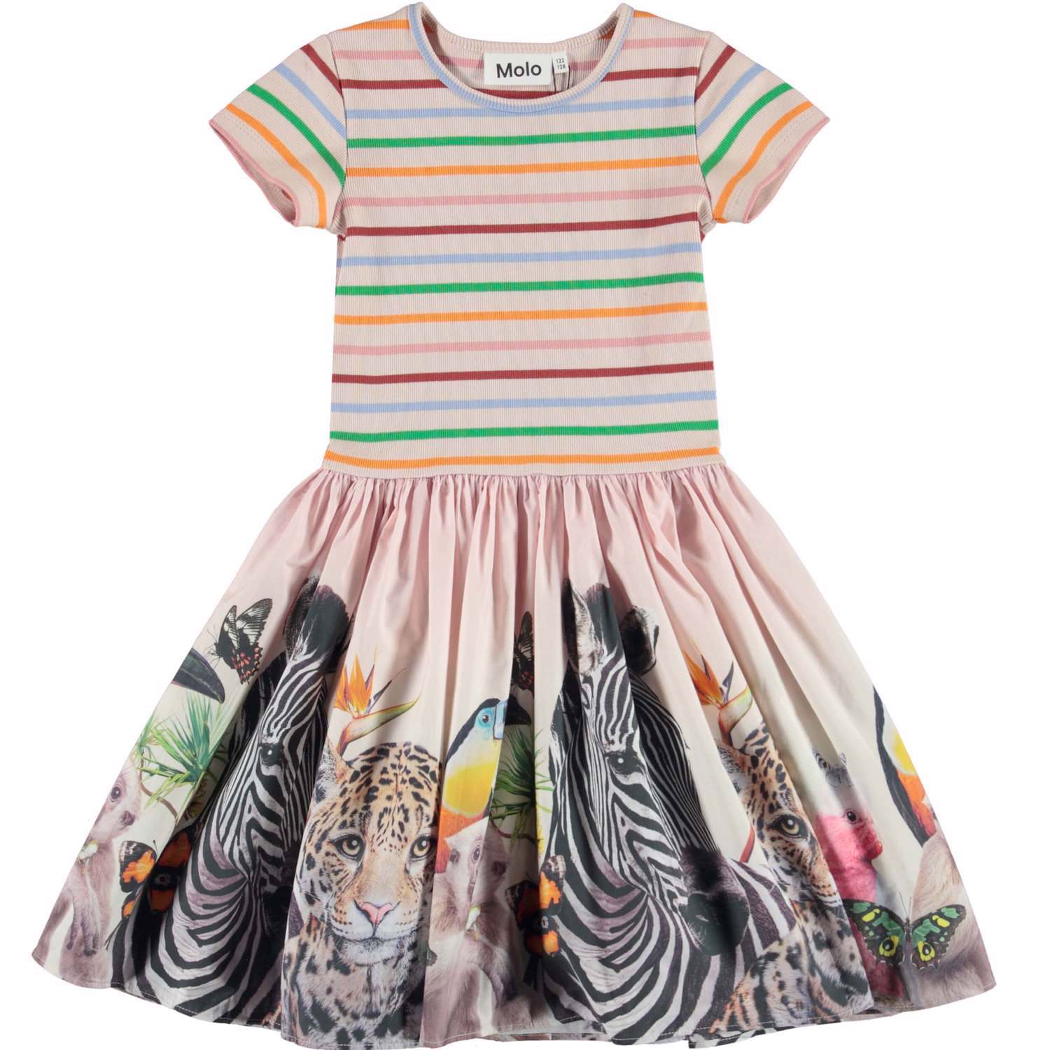 Cissa is a dress with a multi-coloured striped rib on top with short sleeves and a feminine poplin skirt that has a print of the many animals of the jungle.