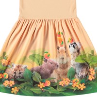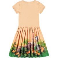 Light orange short-sleeved dress in organic cotton with a fitted ribbed jersey top and smooth jersey skirt. The dress has a regular fit with a cute print of adorable animals, balancing with apricots.