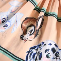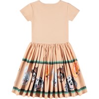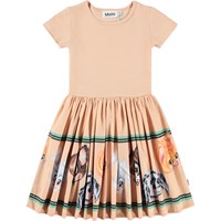 Peach-coloured short-sleeved dress made of organic cotton with a fitted ribbed jersey top and poplin skirt. The dress has a regular fit with a cute print of drawn animals and stripes in black and green.
