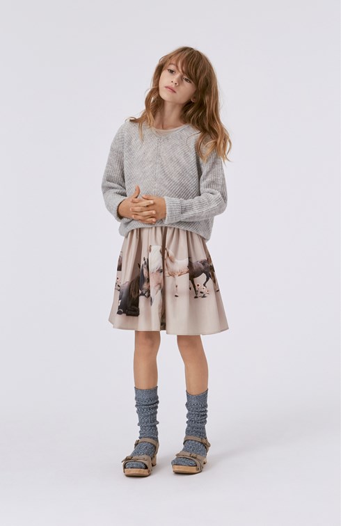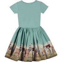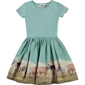 Blue knee length, short sleeve dress with a poplin skirt in a lhama print. The humourous print shows two llamas that are wearing Molo's own knits, and they are all bundled up in hats, infinity scarves and jumpers. This dress is in 100% cotton, has a round neck, short sleeves, a very full poplin skirt and is in a slim fit.