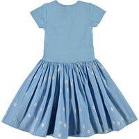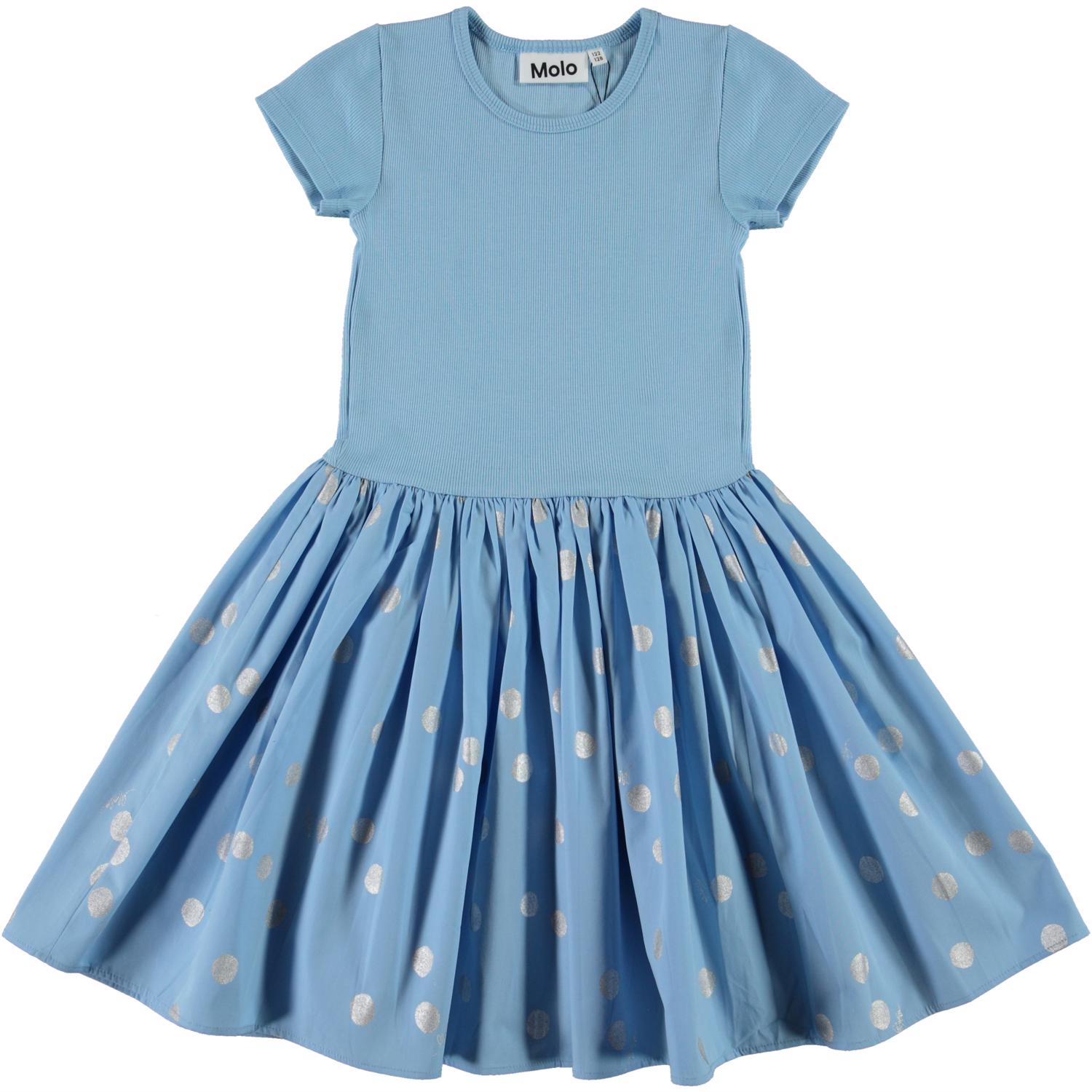 Cissa is a short sleeve, light blue dress in two parts: the top is in rib and the skirt is in a print with silver dots.