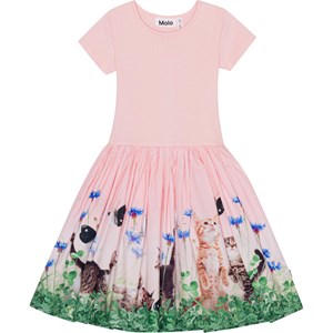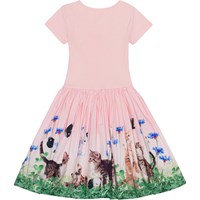 Pink, short sleeve dress with a circular skirt in organic cotton. The top is in a rib jersey and is snug fitting, while the skirt is in cotton poplin with a print of playful kittens.