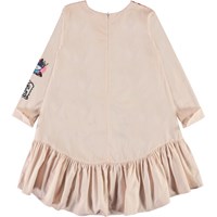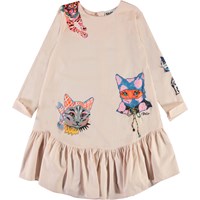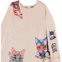 Cixi is a rose poplin dress with a print of ninja cats. The dress has a zip closure at the neck. It has roll up sleeves and a draped skirt.