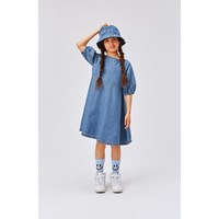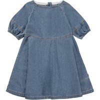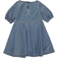Claira is a blue, knee length dress in cotton chambray. The full sleeves have seams that mirror the waist seam. The sleeves have elastic at the bottom, and the dress has a concealed back zip. This dress is partially constructed in organic cotton.
