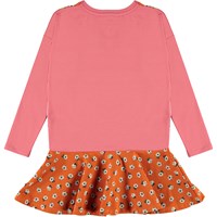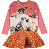 Become a part of the feline family in the Claire dress. The dress has a dark rose top with cats and an orange flowered bottom.