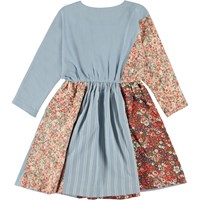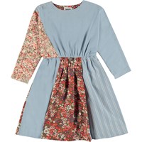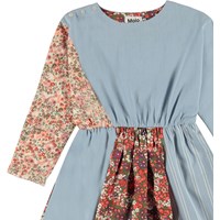 Clara is a long sleeve patchwork dress that is a combination of different Molo prints. There is light blue denim, striped denim and two different floral prints. The dress has a button closure on one shoulder.