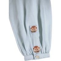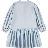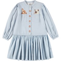 Nice light blue viscose dress. The dress has beautiful buttons at the front, two pockets and an attached circular skirt, as well as button closure at the sleeves. The dress has a print of cute animals by the buttons, as well as in the pockets.