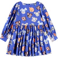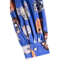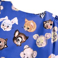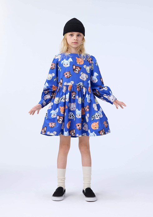 Short blue dress made of organic cotton poplin with a print of drawn animals. The dress has a round neckline, is slightly oversized and has plenty of gathers at the sleeves and skirt. The long sleeves have edge and button closure around the wrist to add fullness to the sleeve. The dress is easy to put on with the invisible zipper at the back.