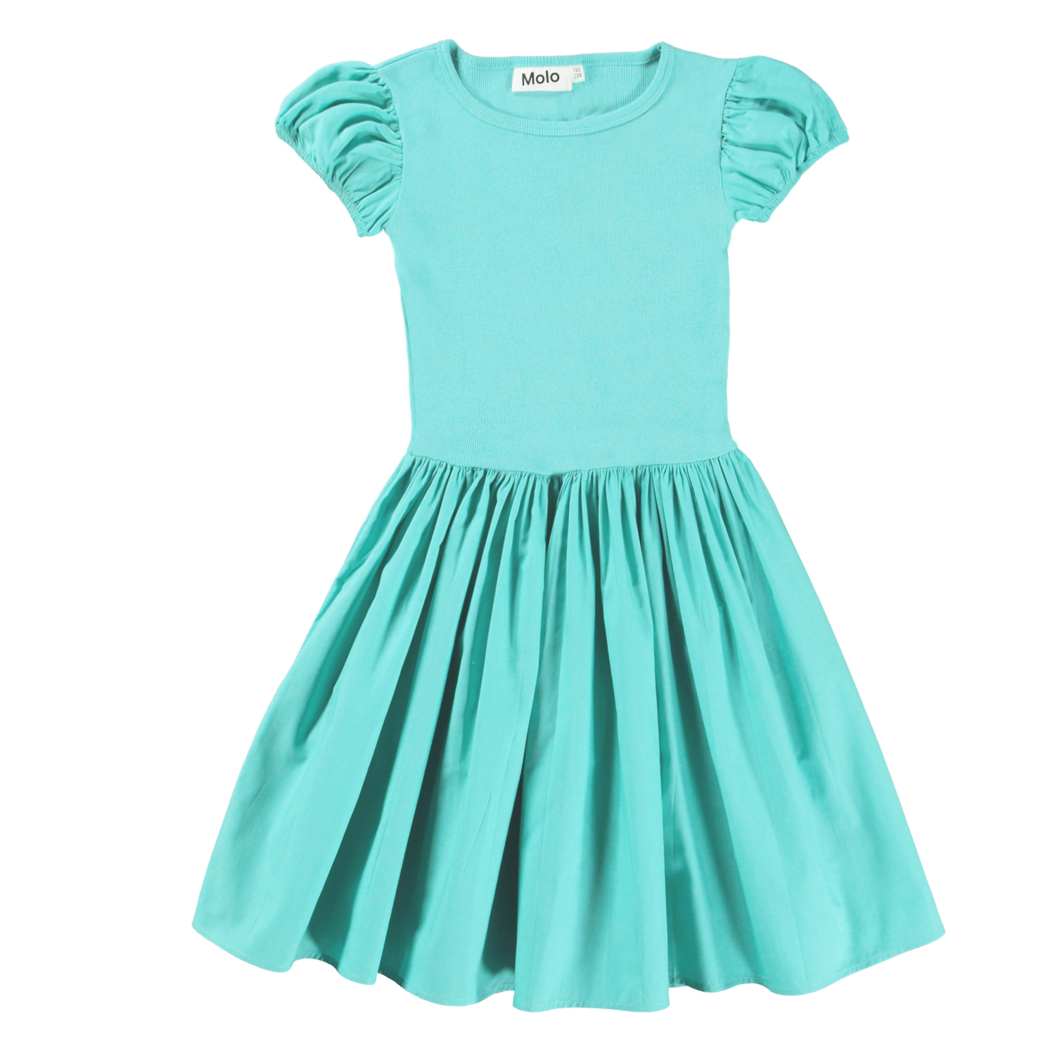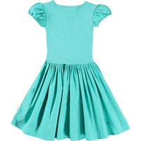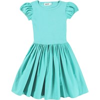 Short sleeve, light blue dress with a circular skirt in organic cotton. The top of the dress is in a snug fitting jersey that makes it comfortable and easy to wear. It has a round neck and small puff sleeves with elastic at the bottom. The full skirt and voluminous sleeves are in a cotton poplin.