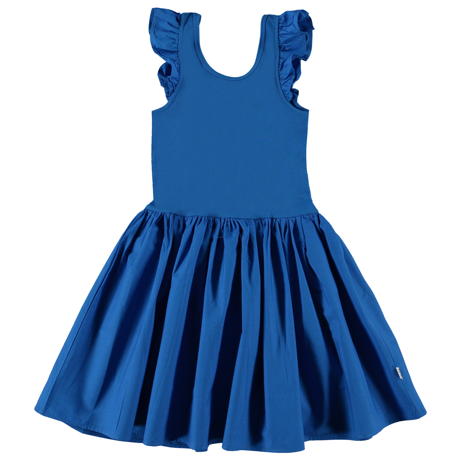 Cloudia is a dark blue, knee length dress in cotton. The dress has a poplin circular skirt and ruffles at the shoulders. The top is in a rib jersey and has a low cut back.