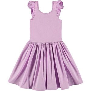 Cloudia is a sleeveless, light purple dress, where the top is in rib with small ruffles on the shoulders. The full skirt is in poplin.