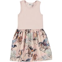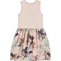 Colleen is a sleeveless dress in organic cotton jersey. The top is in a powder colour, while the bottom is in an all over print of galloping horses with wings of butterflies.