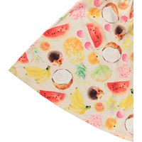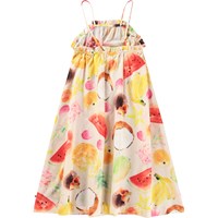 Beige loose dress in organic cotton with a print of colourful, exotic fruits. The dress falls to mid-calf, has thin straps, a deep back, and a pretty frill edge. The material of the dress is light and airy, making it ideal for the pool or beach.