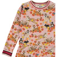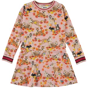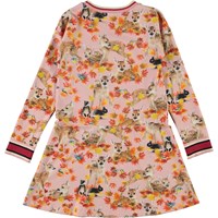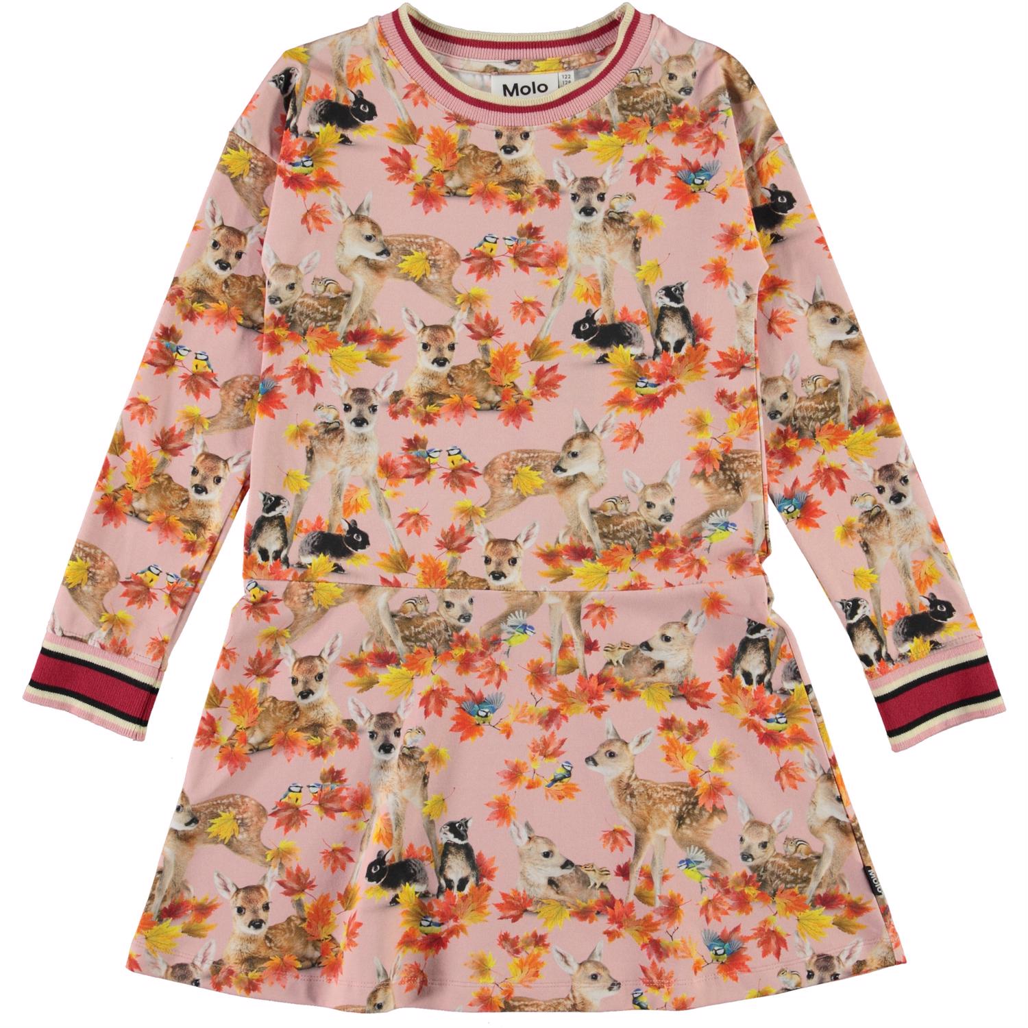 Conny is a pink dress with a print of deer and golden leaves. The dress has long sleeves and striped rib at the neck and sleeves.